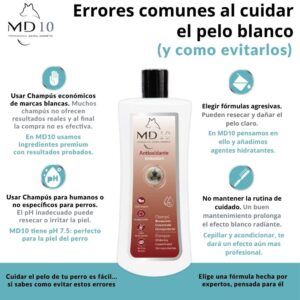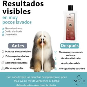 • Champú blanqueante para perros que elimina el óxido producido por el agua, la orina, y las babas de la barba, sin olvidarnos de los codos en algunas razas.