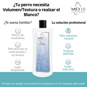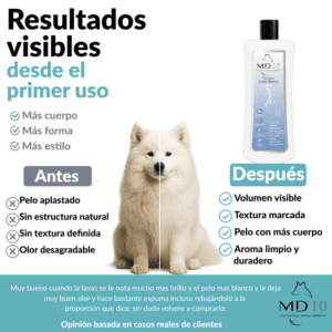 🧴 MD-10 desarrolla fórmulas dermoprotectoras que no irritan los ojos y respetan el pH natural de cada especie, protegiendo la piel de inflamaciones, caspa y sequedad.